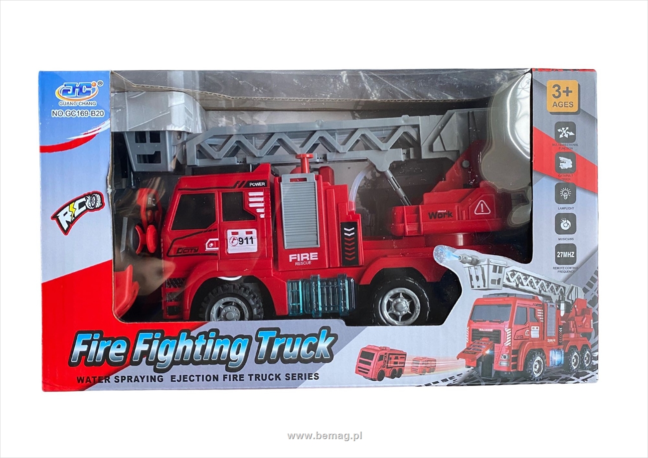 -Auto Straż Pożarna RC 27MHz + małe autka x3 światło armatka wodna ładowanie USB28x14x10cm window box 012999