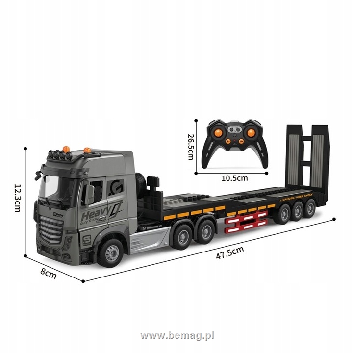 Ciągnik siodłowy z lawetą, metalowy na radio, światła, muzyka, skala