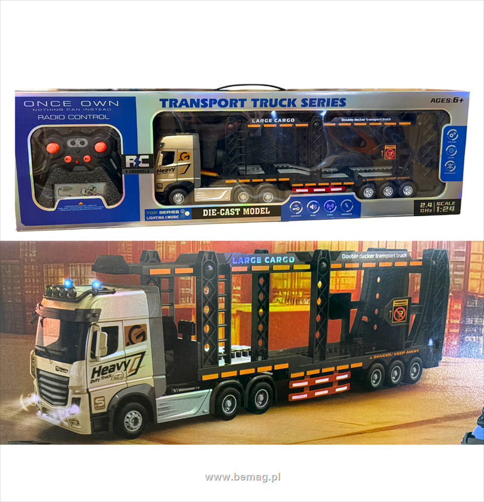 Ciągnik siodłowy z lawetą piętrową, metalowy na radio, światła, muzyka