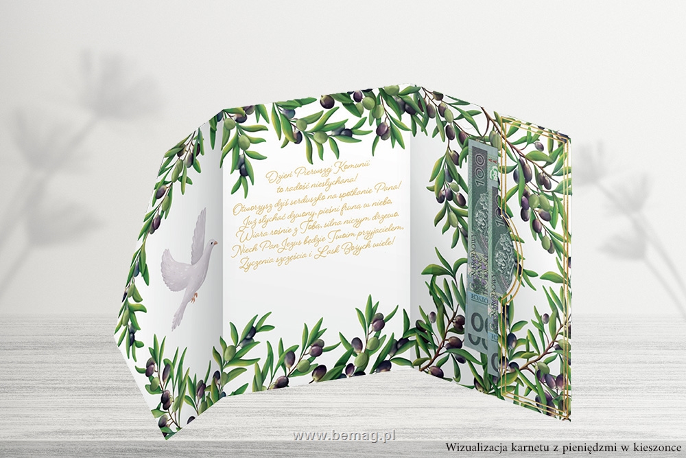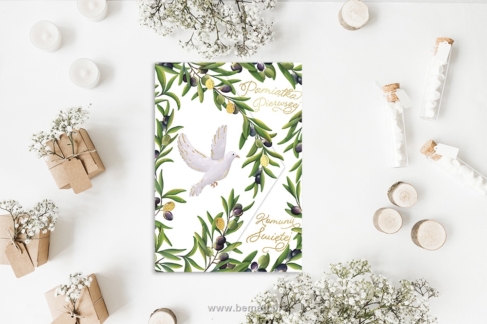 KARNET A5 KOMUNIA KOPERTA OLIWKI I GOŁĄB