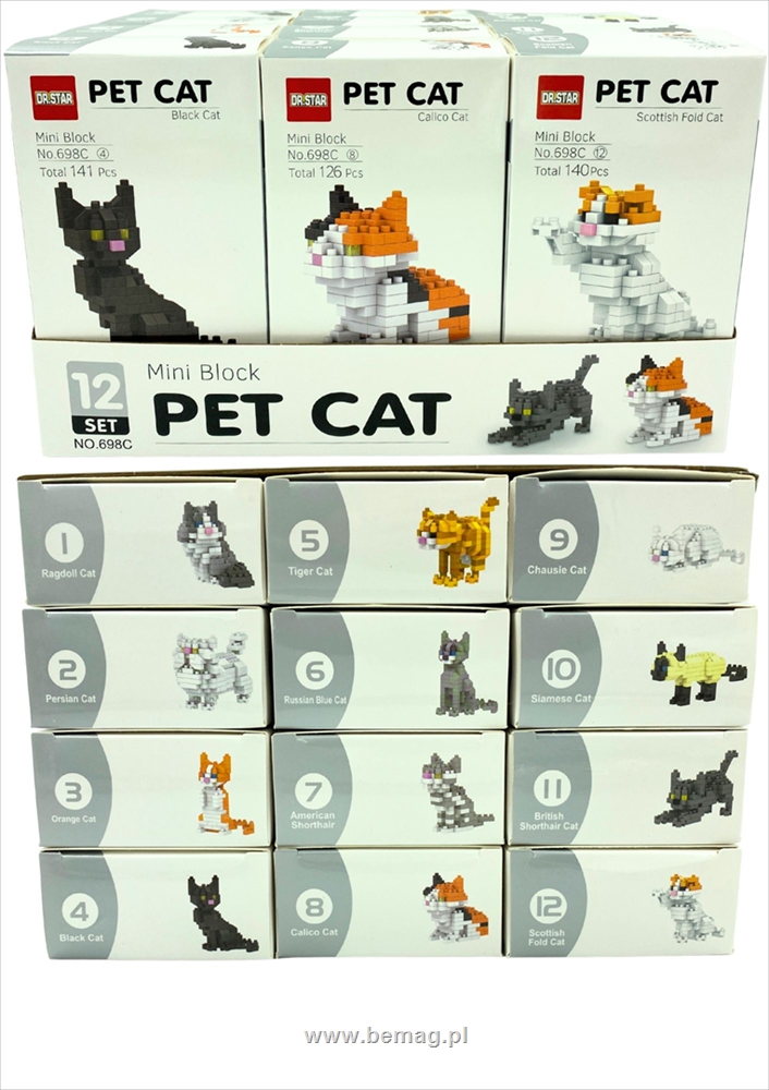 Klocki konstrukcyjne kotki, 12 różnych ras kotów, ilość elementów okoł