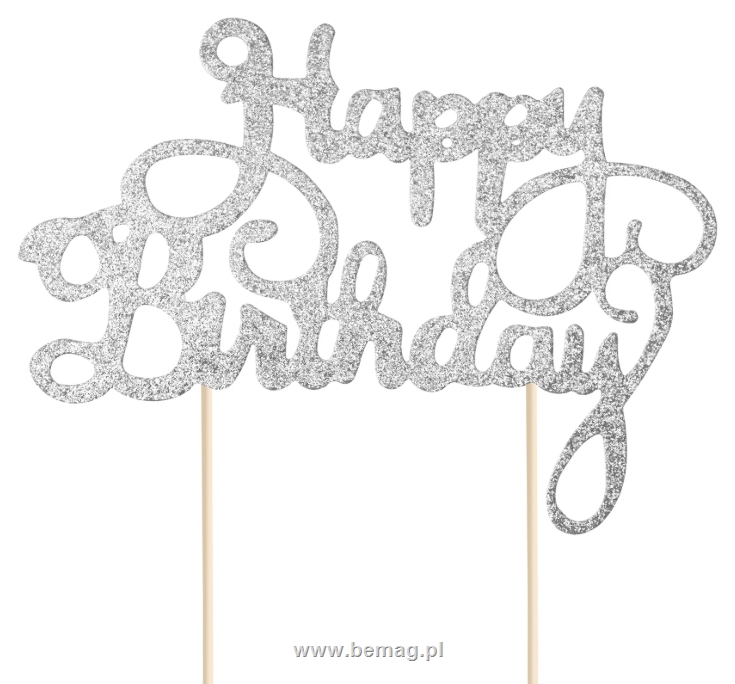 Topper na tort Happy Birthday brokatowy srebrny 1szt. 512275