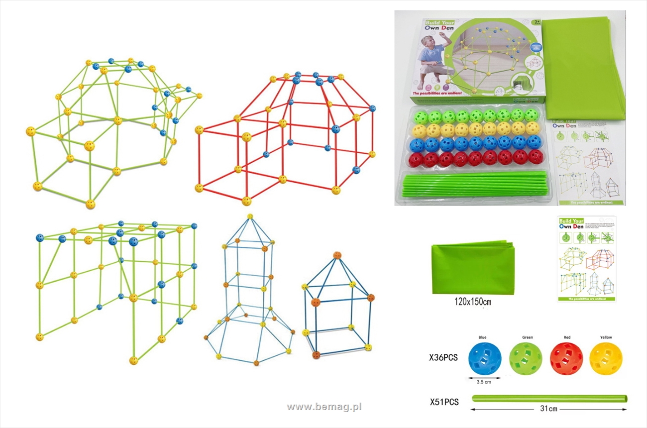Zestaw konstrukcyjny do zabawy 36 kulek + 51 patyczków +materiał do zbudowania namiotu w kartonie 34x24x4 cm NT6367