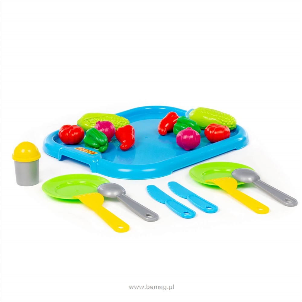 Zestaw naczyń dla dzieci z niebieską tacą i zestawem zakupowym (19 elem.) (w siatce)