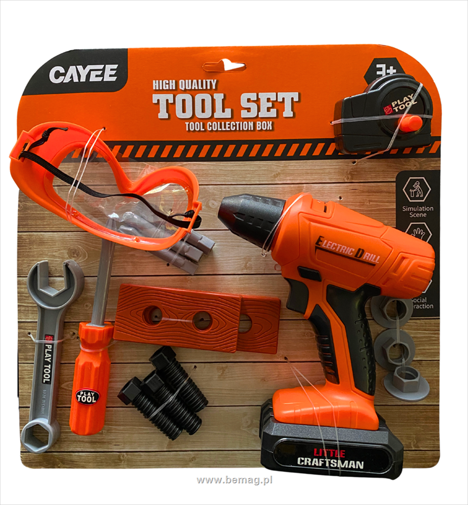 Zestaw narzędzi, wiertarka akumulatorowa, metr, wkrętak, klucz, zasila