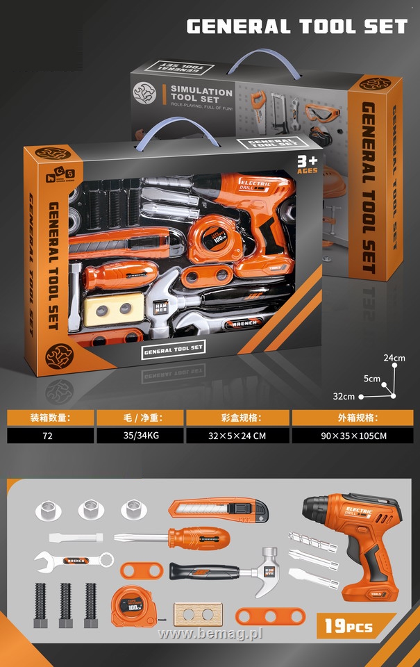 Zestaw narzędzi, wkrętarka 18x12cm, akcesoria, młotek, nożyk klucze, i