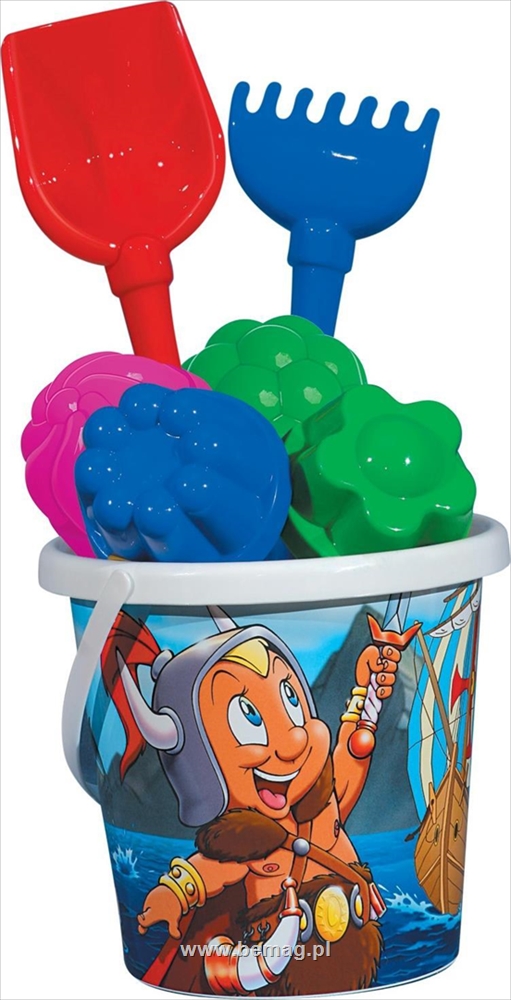 Zestaw Nr120: wiaderko z nalepką, łopatka Nr5, grabki Nr5, 4 foremki