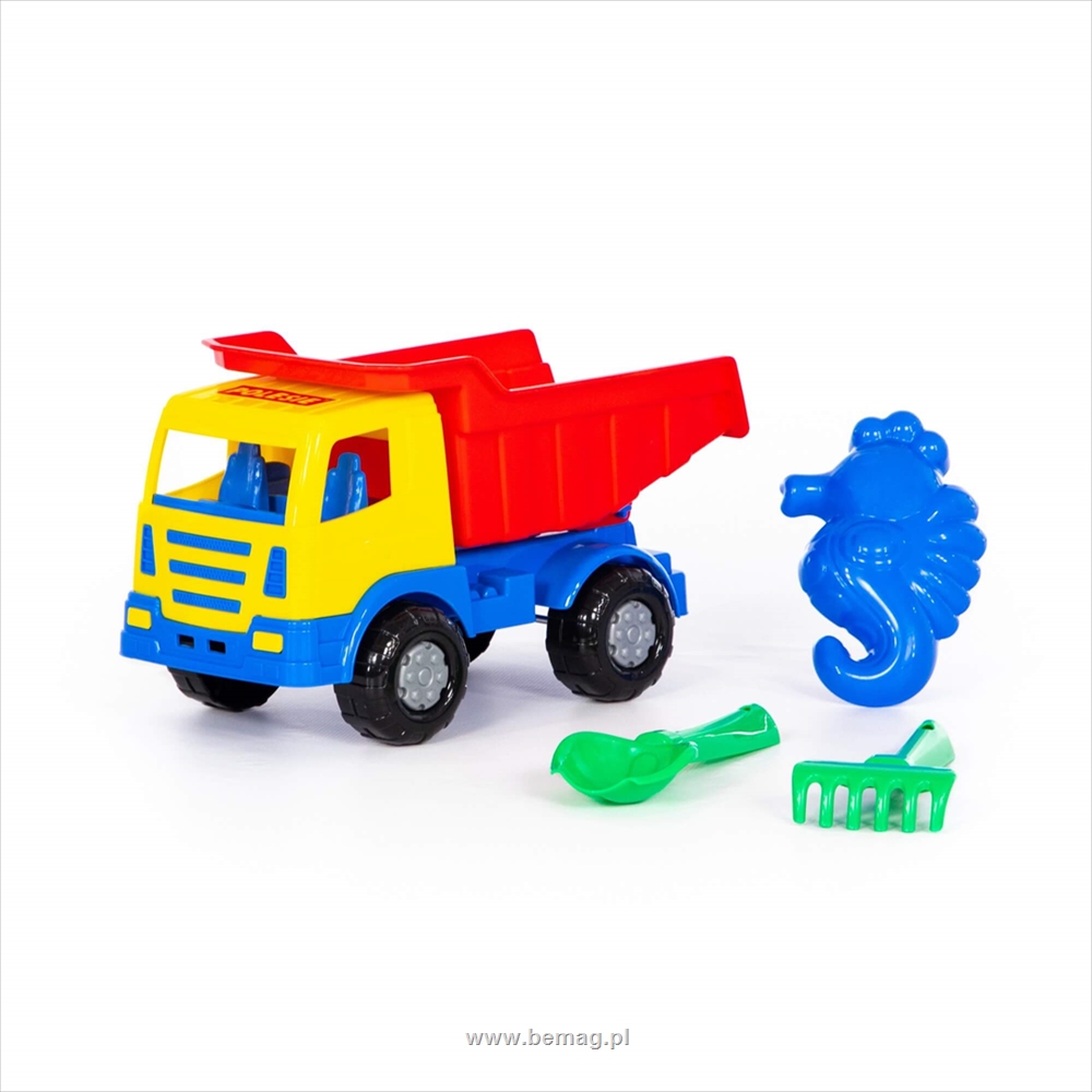 Zestaw Nr645: Miraż, samochód-wywrotka + szufelka Nr2, grabki Nr2, foremka (konik morski)