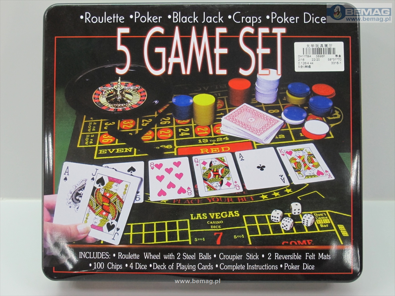 Kasyno (ruletka, poker, Black Jack, poker kostkowy), dwie talie kart, żetony. Pudełko metalowe 32x28x6,5cm