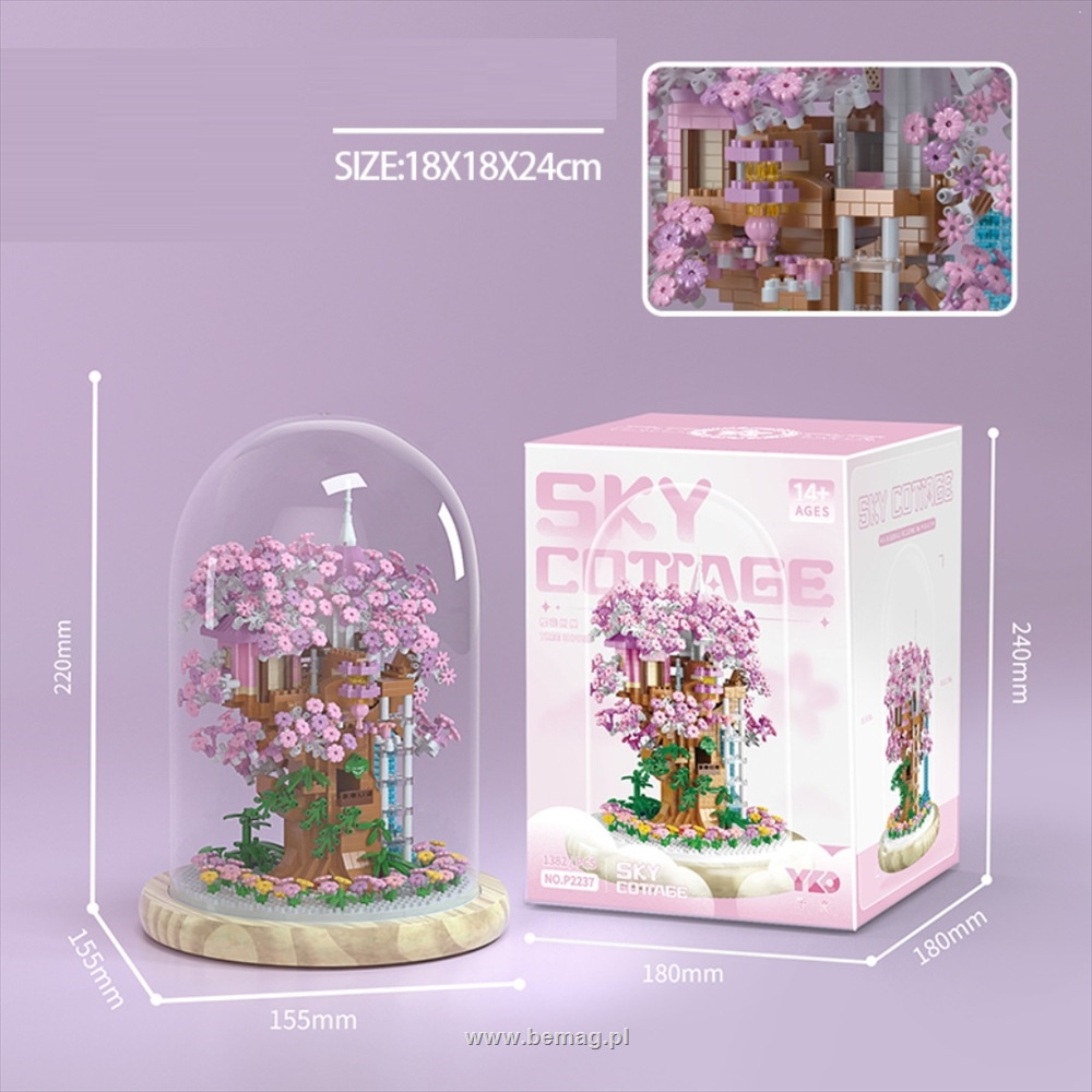 Klocki konstrukcyjne domek w kwitnącym drzewie pod kloszem, wymiary po