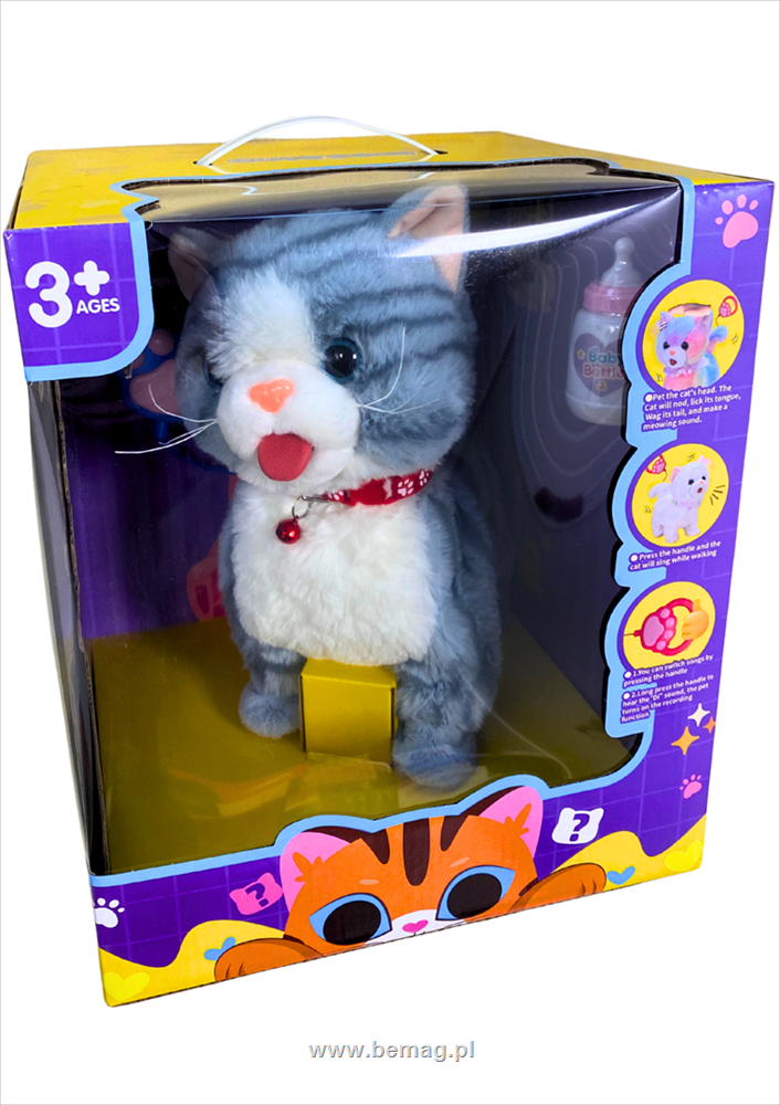 Kotek pluszowy b/o na smyczy, dźwięki, chodzi, funkcja nagrywania, zas
