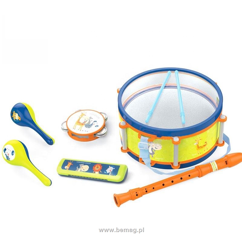 Zestaw 9 instrumentów w zamykanym bębenku: flet, tamburyn, harmonijka,